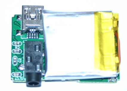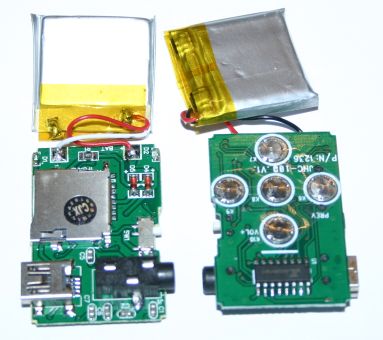 This is small MP3 player PCB. It requires a micro SD card (up to 8Gb, not included) to store MP3 files. It includes an USB port to load the files, which also serves to charge the included accu. On the back of the PCB are dome buttons for the functions typically found on a small player: previous, stop/resume, next, volume up, volume down. The link shows how a microcontroller (Arduino) can be interfaced to this module.