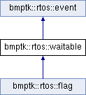 Waitable is an abstract class (there are no objects that are just a waitable). flag, timer, clock and channel are concrete classes that inherit from waitable. A waitable is always created for a particular task. A maximum of 31 waitables can be created for each task. (Actually the maximum is 32, but one waitable is created internally to implement the rtos-version of the wait() call.) A waitable can be two states: set or cleared. A waitable is initially cleared.